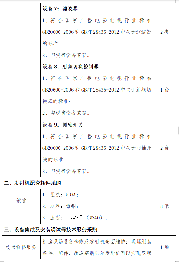 本項目招標內容為采購電視發射機房發射機備件、配件一批,并把這批配件用于對高明發射臺的一臺高斯貝爾發射機進行設備升級,實現對兩臺主發射機(DS-18和DS-36)的冷備份。